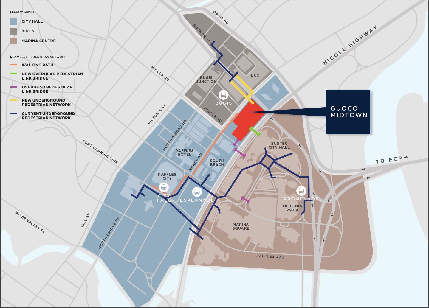 Guoco Midtown is at the intersection of two major growth corridors: Beach Road and Ophir-Rochor Road, and connects three micro-markets: City Hall, Marina Centre, and Bugis. Guoco Midtown, when constructed, will be a premium, lively commercial and lifestyle destination, drawing a dynamic population that will revitalize and reposition Beach Road.
