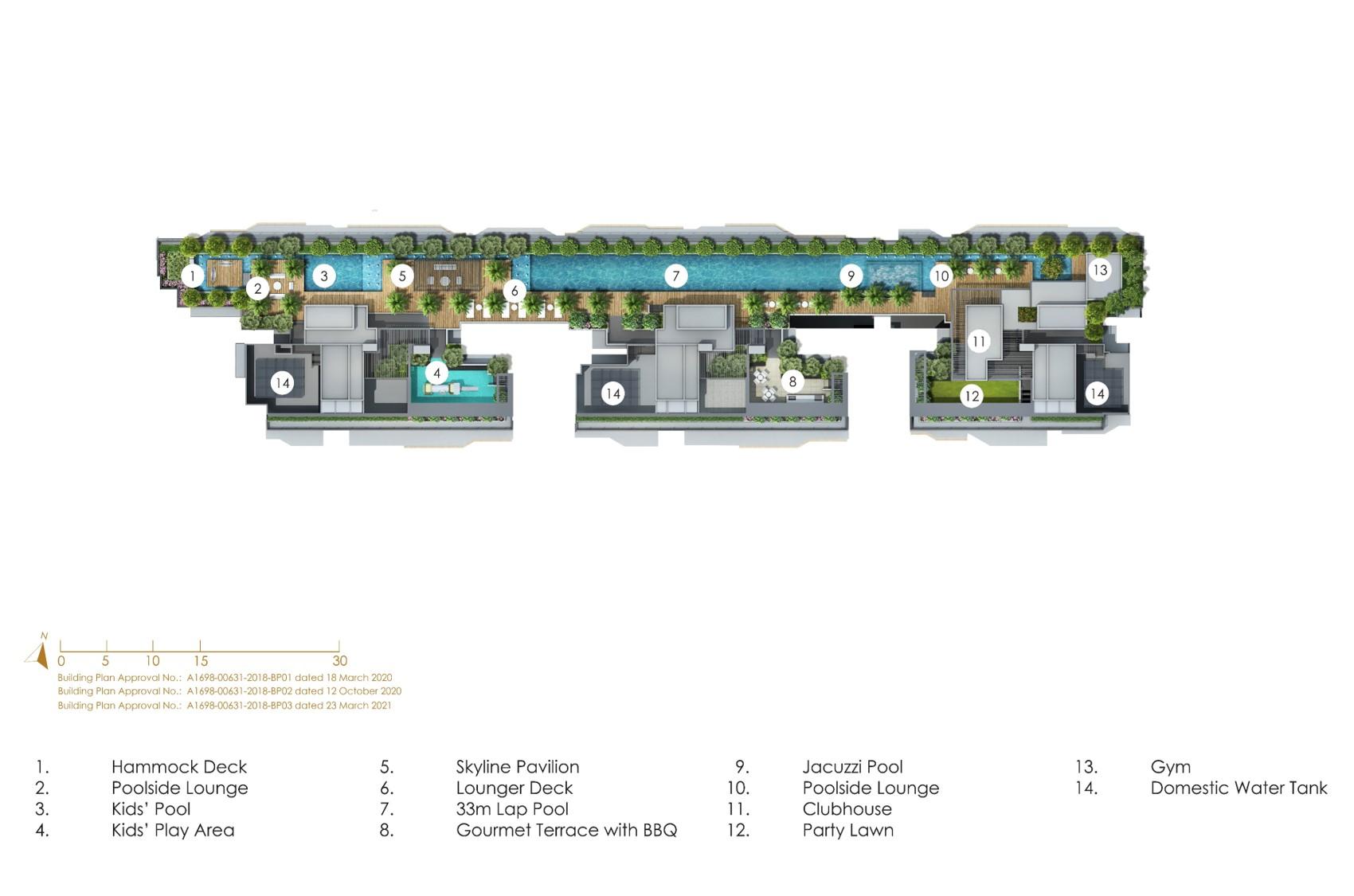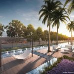The structure sits in a natural setting, complete with courts, terraces, and lush flora. On the ground, the natural environments’ qualities complement the interiors, as the spaces and vistas softly integrate into the nature. The pleasures of a leafy garden can also be found in the sky. The openness of the top level sky patio promotes connectivity and engages people. The sky-garden here shares a large community area that is intertwined with a number of features that stimulate social connection and engagement.